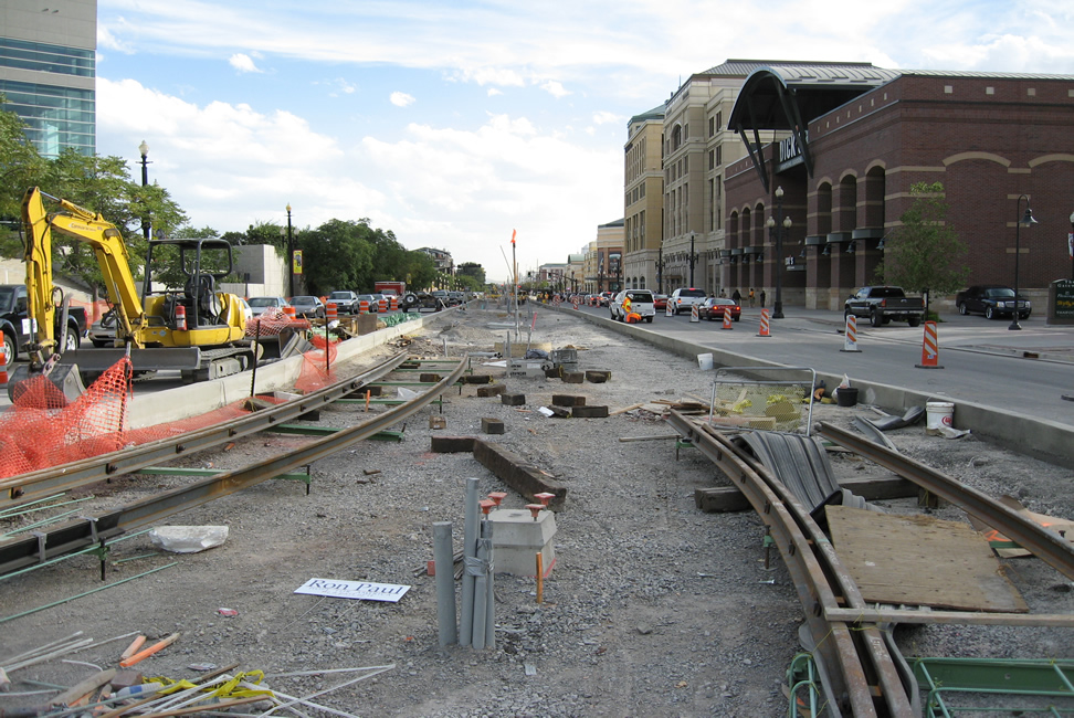 Looking from previous vantage point, farther south down 400 West Street in SLC. Note that even though Trax is in the street, in has a separate right of way. The tracks will be covered with concrete panels. The only time Trax shares roadway with autos is in the case of some left turn lanes.