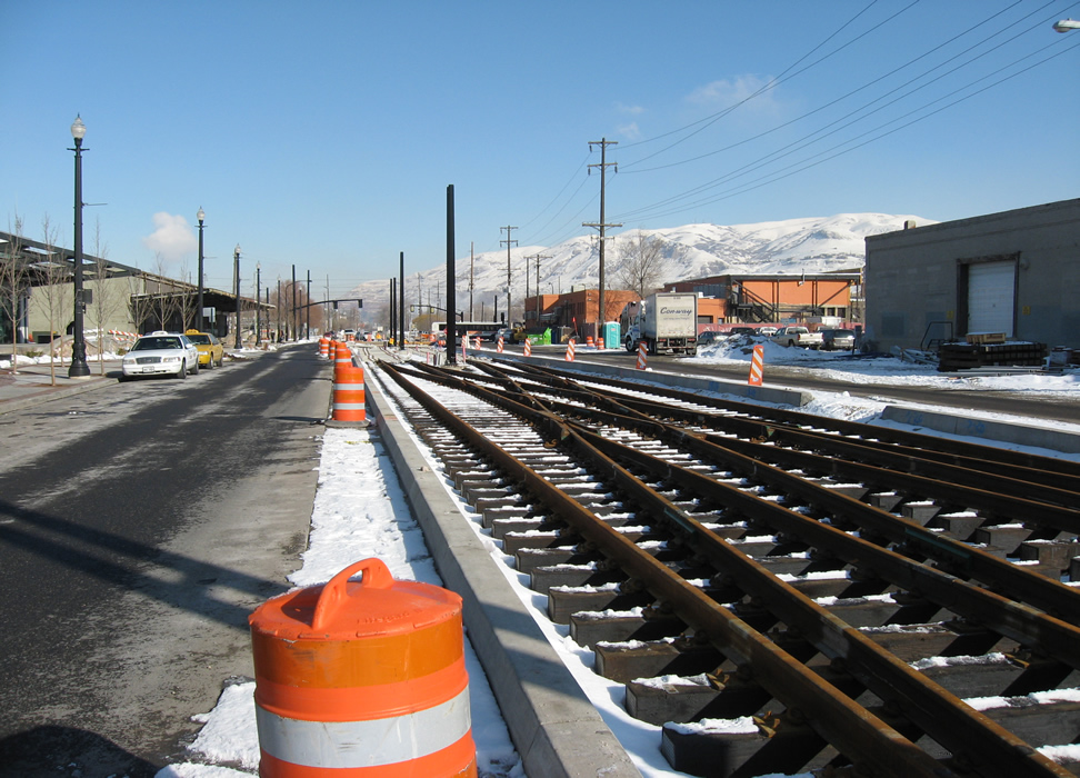 The following photos show the new TRAX extension abuilding from Arena station to the Intermodal Hub. We will follow catenary installation in future enstallments. Last week of January 2008. Note the impressive TRAX double crossover below. Next