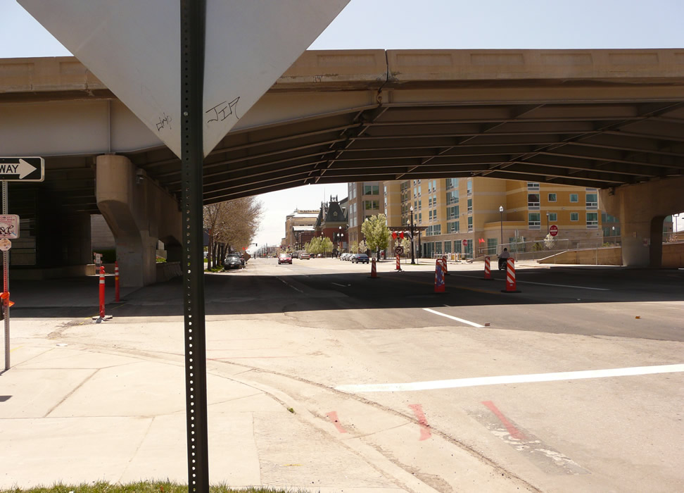 400 West Street. Airport TRAX will descend to this street, turn south away from camera and join TRAX main in front of UP station. Next