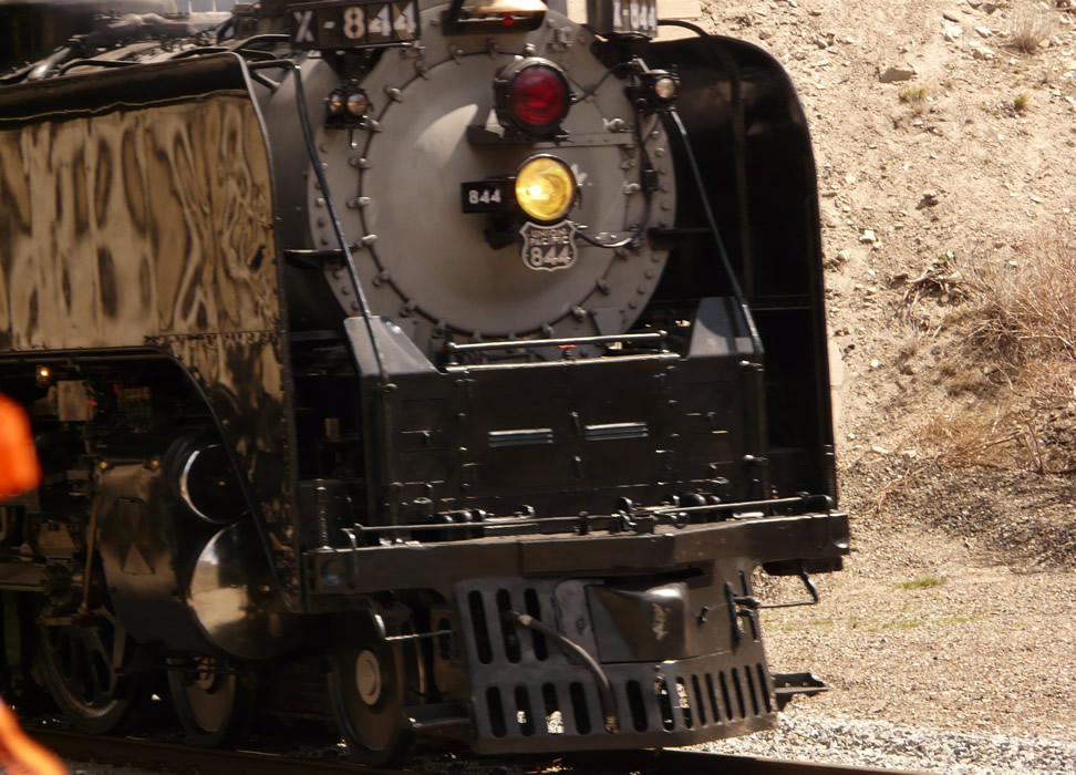 Sunday morning, Easter 2009, my wife and I waited under an I-84 overpass in Weber Canyon Utah, for UP 844 and consist. Then suddenly, the signal turned green. I jumped out of the car and almost didn't have time to make this shot of 844 heading west under the overpass. He was moving at a good clip. More