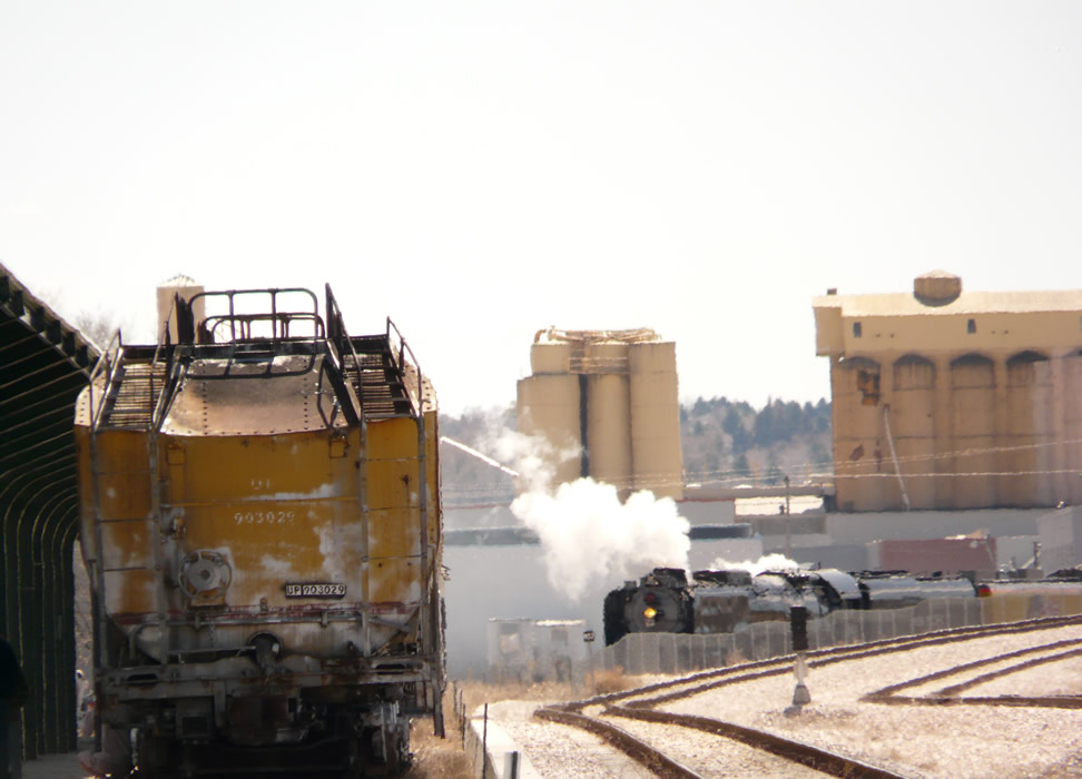 844 and consist enter Ogden Union Station (Utah Railroad Museum). Frontrunner mains are at right. Frontrunner doesn't run on Sunday. More