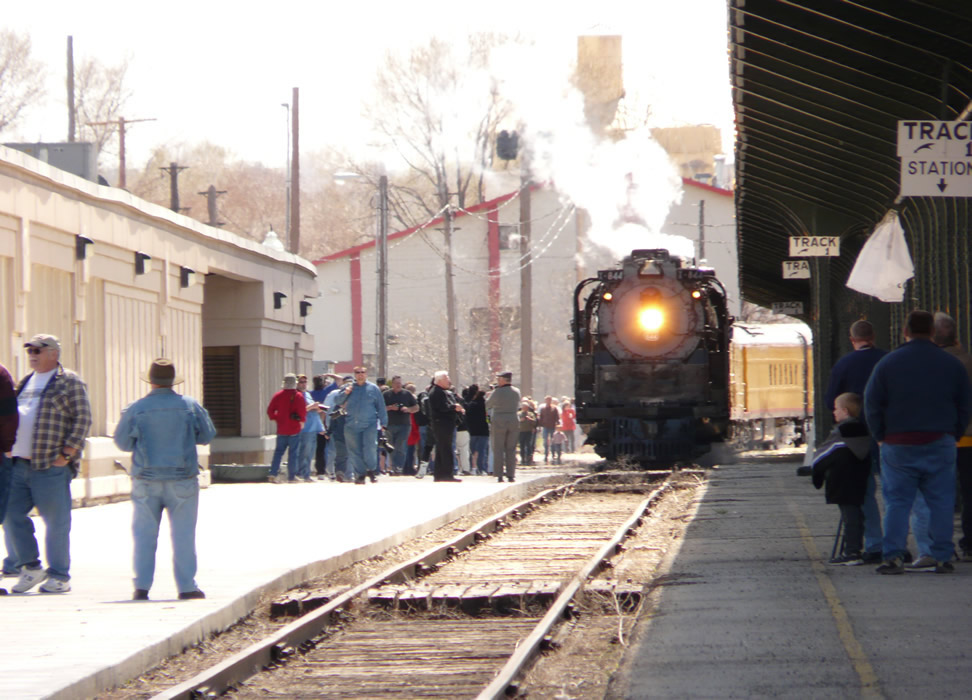 844 and consist enter station track. Railfans are out in force (plus some general public).