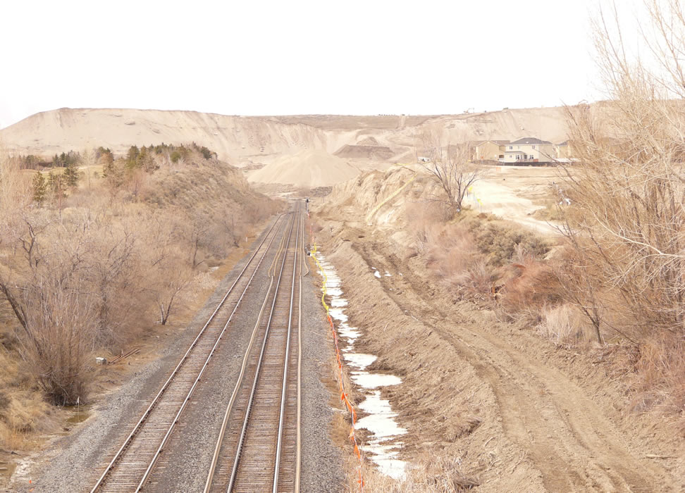 Looking north at Thanksgiving Point cut. Jordan River Narrows is in distance. Frontrunner South will operate at left. Considerable UP realignment is coming. Note replacement rail on UP. Next