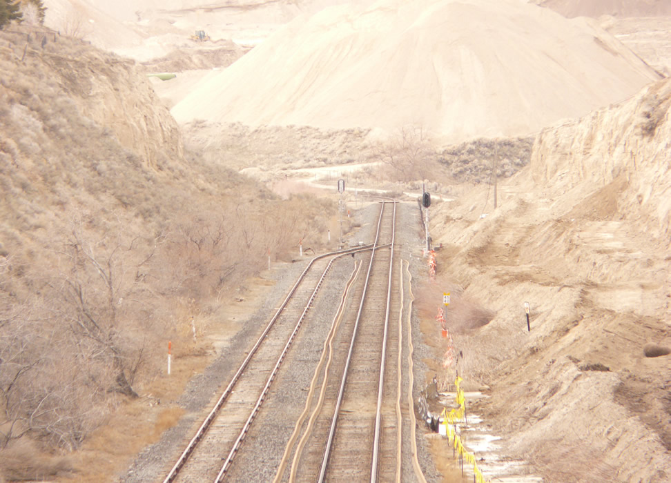 At Thanksgiving Point cut, looking north using telephoto, Jordan Narrows are in distance. Note UTA contractor dozer at upper left. Also note UTA Frontrunner fiber optic pole indicators at left. Return