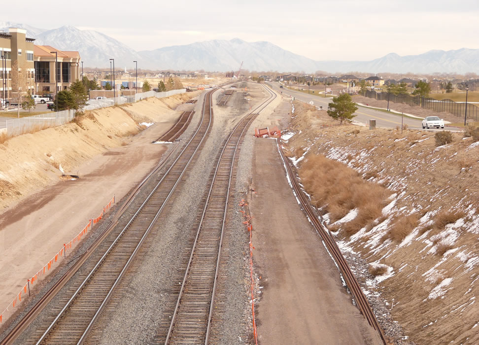 Looking south at Thanksgiving Point just south of the Jordan Narrows and the county line we see station construction in the upper-center, and UP operating on a piece of Frontrunner South to the right. Note that UP will be shifted to the left when construction proceeds. Next