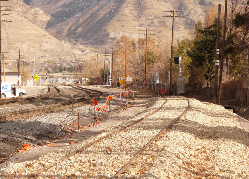 Father west by big turn to north, looking east, ballast is laid but not leveled. Note Frontrunner block signal in center. Next
