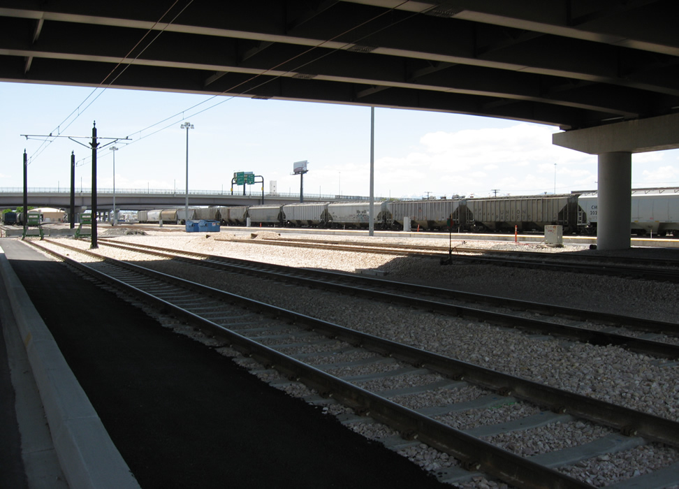 Here is the same crossover, looking to its switch on the Frontrunner main. There's not much room to do anything on the Frontrunner side, at right. Eventaully Frontrunner South will be built and the two Frontrunner mains will extend on south. For now, there's not much switching room, but an accomodation has been made to move equipment between the two systems. Note that TRAX equipment is maintained at a separate shop at the south end of Salt Lake County, apart from the Frontrunner Warm Springs shops. Next