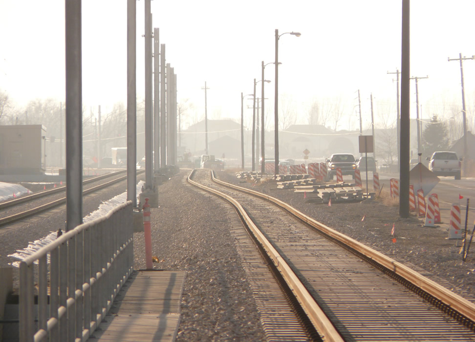 Better view of substation and developing catenary. Bangerter Highway is below railing. Note the filthy air. There is no evidence of a passenger station stop or bus interface. Next