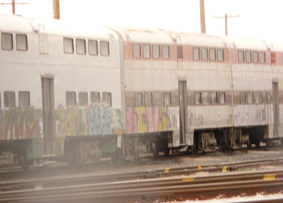 Here is a view of the some of the METRA cars showing graffiti. Note: car in forground may not be a METRA car. Next