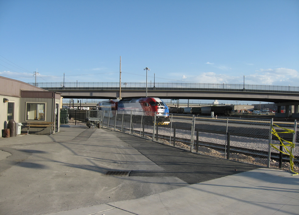 Frontrunner consist stands at the ready at Salt Lake Central Station w/Amshack at left. Cal Zephyr boards at platform to the right of this consist. Return