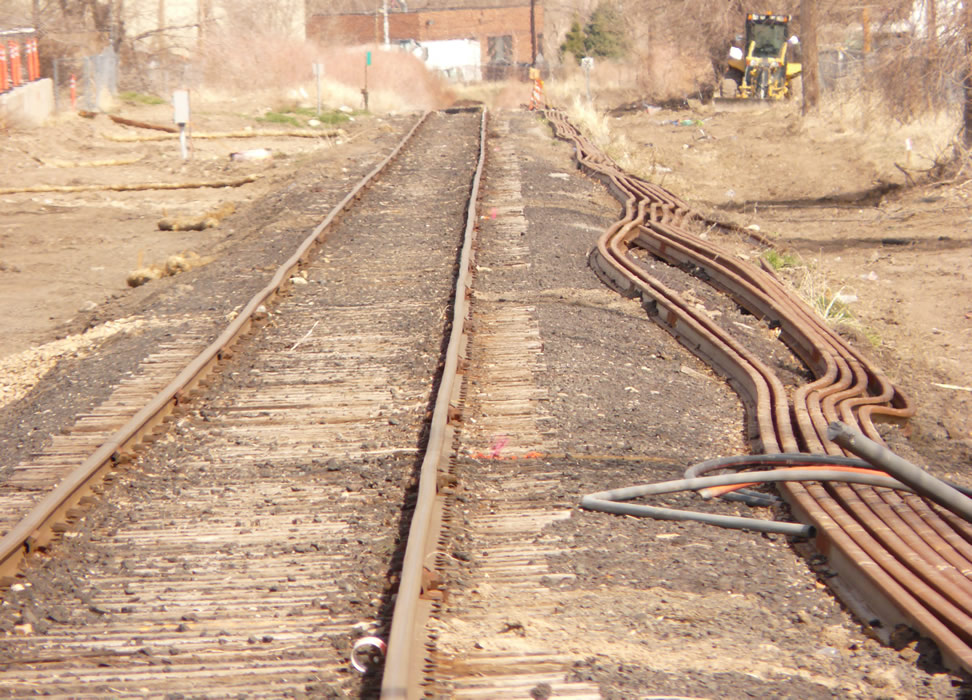 At the same point, looking east, we see new UTA welded rail from the UTA welded rail plant in North Salt Lake (20 miles to the north). Of course this old D&RGW branch trackage will be replaced by TRAX double track on mostly concrete ties with crushed stone ballast. Next