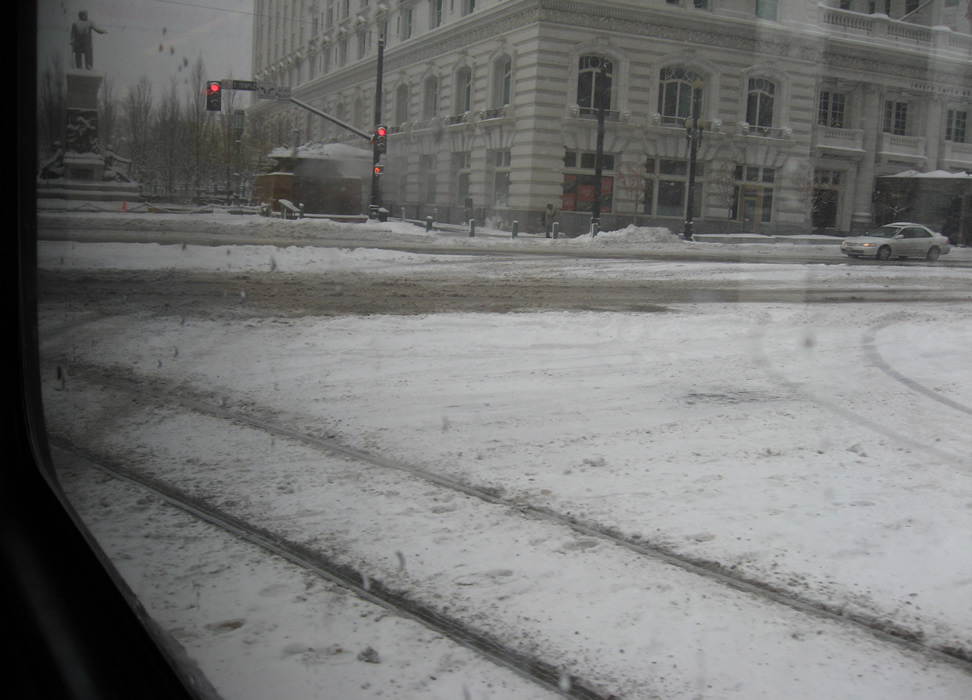On Martin Luther King Day, 2008, in heavy snow, making turn onto the Main Street - SLC