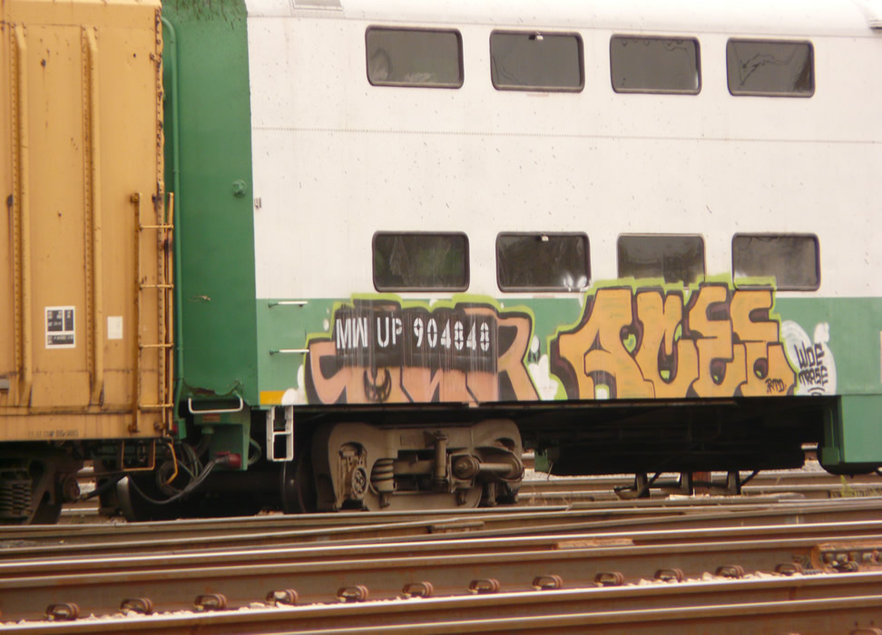 This METRA car is now part of the UP Maintenance of Way fleet for duties unknown to me. This one METRA car which has an unusual (and maybe a little bit humorous) fate. I don't know what its METRA number was. Return