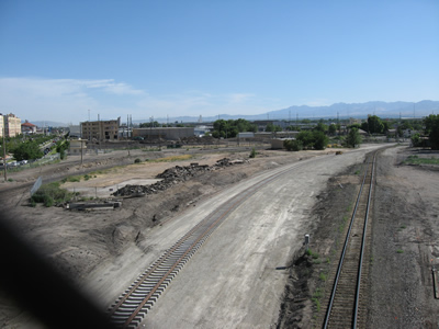 This is just to the left of the previous picture, facing east. In the distance is the old Rio Grande station. We are facing its back. It is now completely land-locked, but its classic Rio Grande sign on the roof is lit up magnificently every night. The State of Utah, which owns the station, tried to take the sign down, but the Rio Grande Cafe on the lower floor insisted that their lease included the presence of the sign, so we still have it. Good for them! |