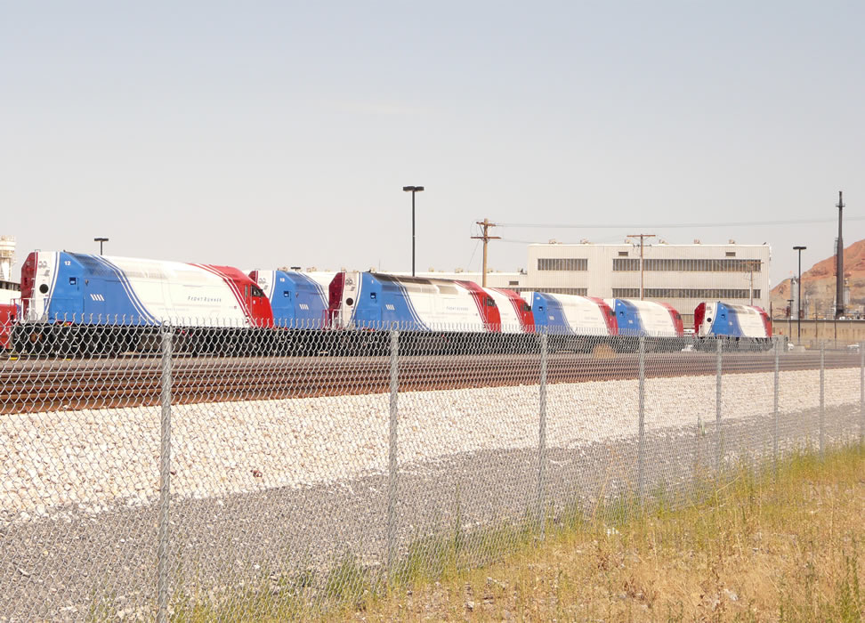 Here on 8/7/2009 we see newly arrived power from Boise Locomotive (lineup on left track) for Frontunner, seen at Warm Springs Shops. Next