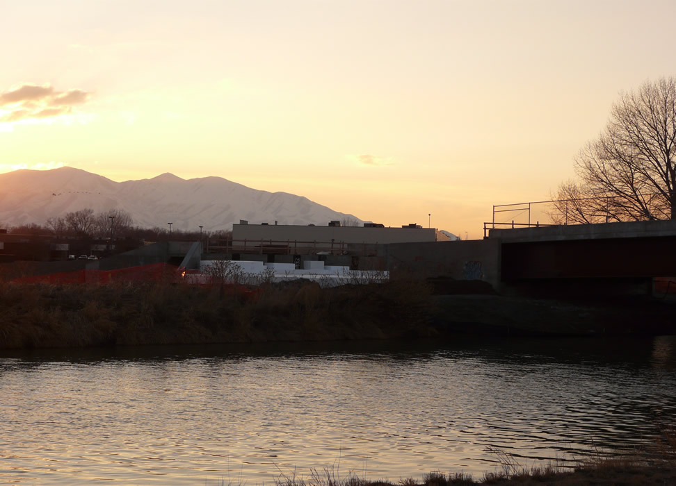 Western approach to bridge. Note the Geofoam fill. Oquirrh Range in distance.