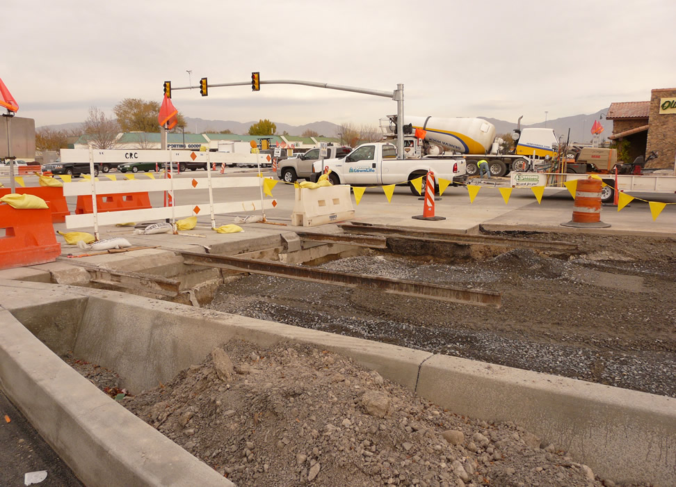 Shows active construction of TRAX on West Valley City's main local street, Constitution Blvd where it crosses 3500 South. Next