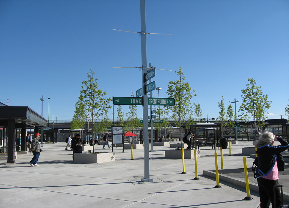 We take a ride, on the evening of May 15, 2008, on newly established UTA Frontrunner commuter rail between Salt Lake City and Ogden. While we make a round trip from SLC to Ogden, most photos are of the northbound part of the run on the way to Ogden. We are in the trailing car with a back facing seat, with the consist in pull mode. Of interesting note, is the fact that Frontrunner is a left-running railroad at station divergences and on double track, whereas its sister rail operation, light rail Trax, is right running. Below is the plaza at the Salt Lake Central Trax station, next to the Intermodal Hub. A nice job, wouldn't you say? Next