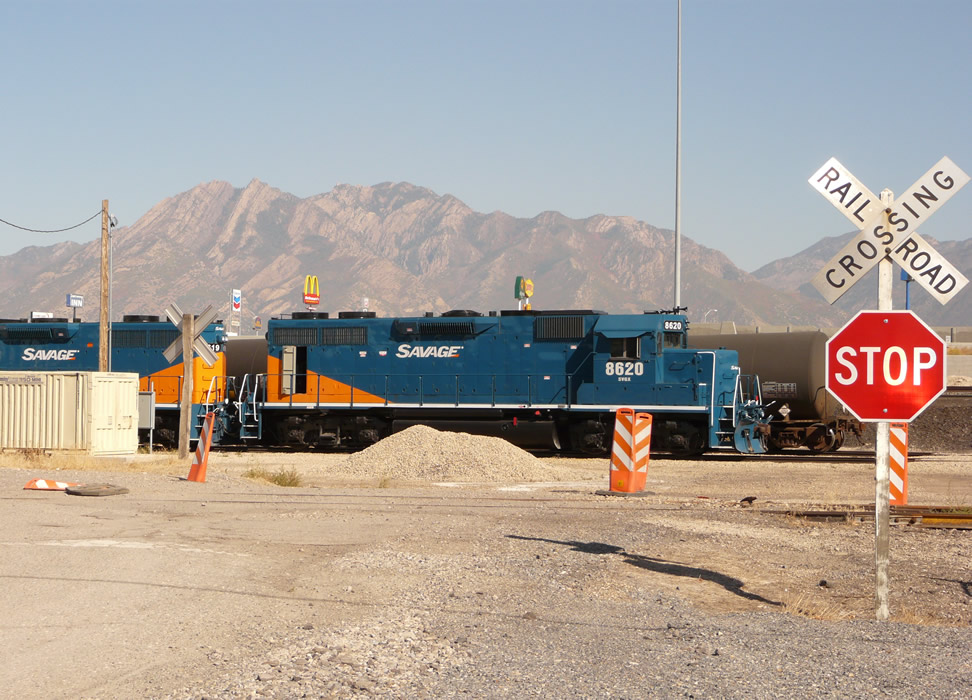 It's Sunday, 9/27/2009, and we are at the combined Savage and Utah Railway maintenance base in Midvale Utah, close to the base of the TRAX Mid-Jordan branch take-off. Savage has two EMD's and two GE's. Savage operates over the Mid-Jordan Branch now and will do so when that branch is completely converted to UTA use. The branch is a former D&RGW line. Shown are the EMD's. Next