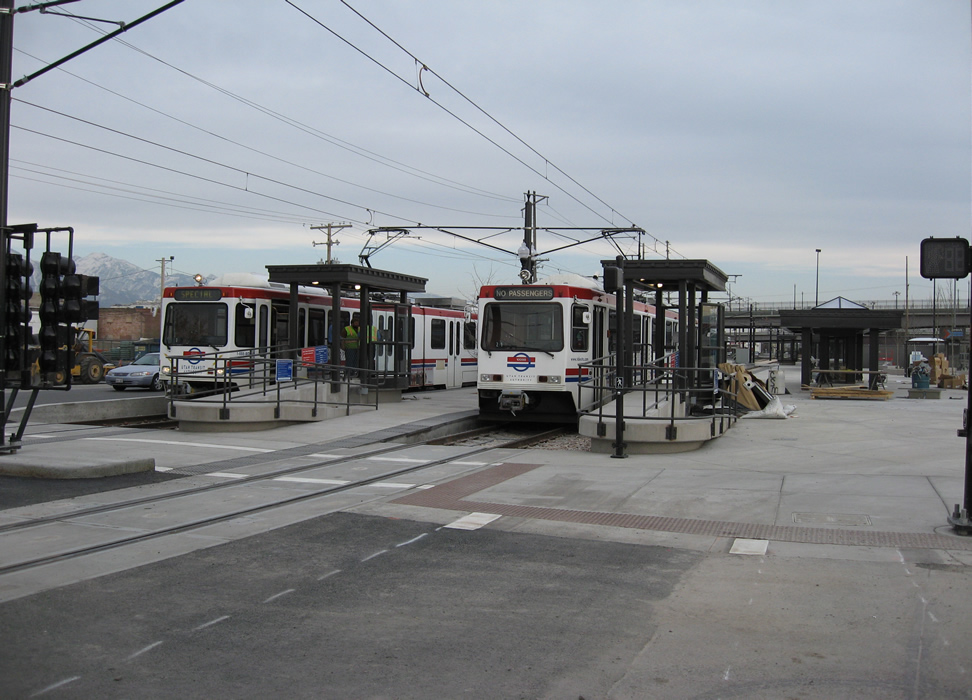 This is the Trax station named "Salt Lake Central." It is right by the Intermodal Hub. Shown are the other two testing Trax trainsets. Next