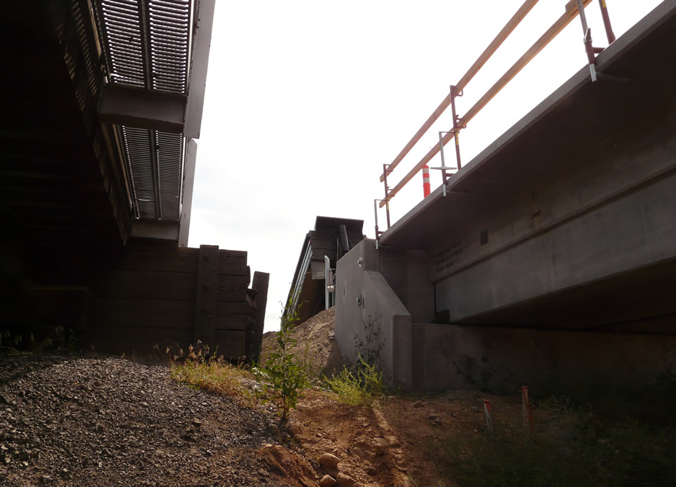 Shot from same spot, looking opposite direction, we see dump truck dumping ballast on new TRAX trackage leading to the new bridge. Next
