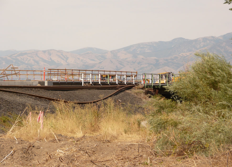 Long view of bridge site, looking NW. New TRAX ribbon rail. Old bridge is in foreground.