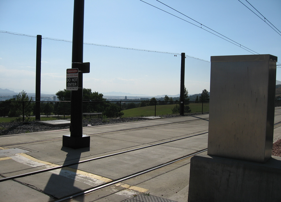 Looking west from Capecchi station. In the distance is the Great Salt Lake and Antelope Island. The domed building in the distance is the Utah state capitol. Next
