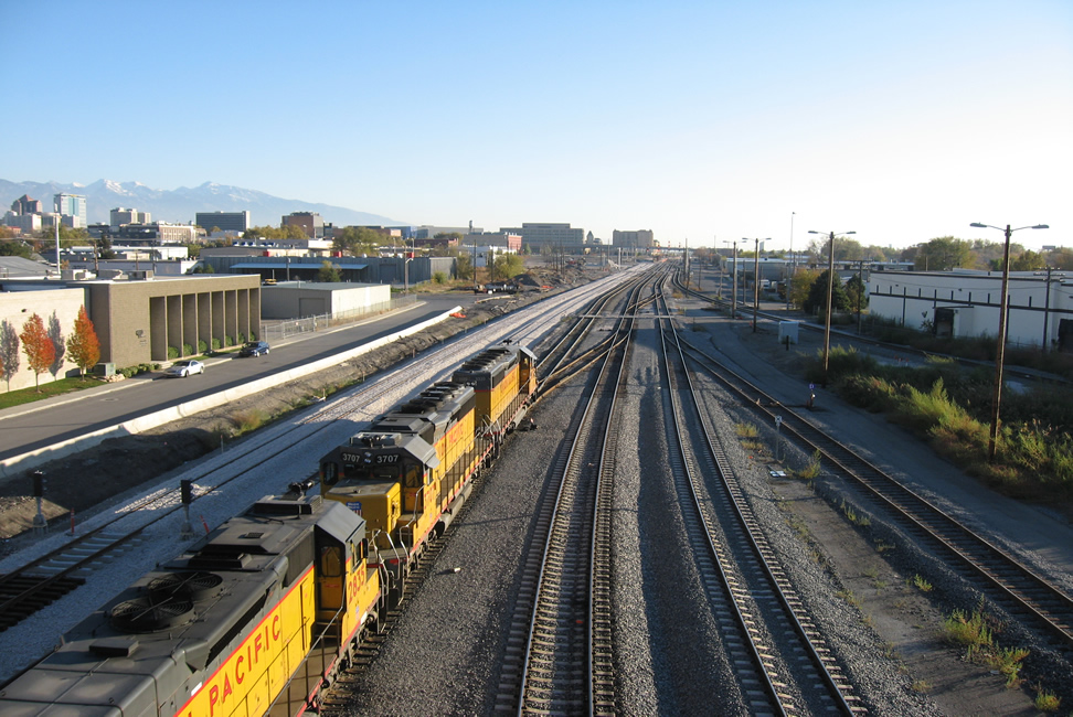 This photo was taken from the 6th North overpass in SLC. New Frontrunner mains with white ballast are at left. UP Grain train in center is westbound. Return