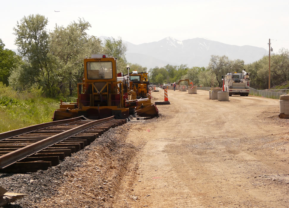 First rail on West Valley TRAX branch! It's 5/21/2009. We are in Jordan bottoms west of SLC, looking west to the Oquirrh (pronounced "Oaker") Range. Note use of wood ties instead of TRAX standard concrete. Next