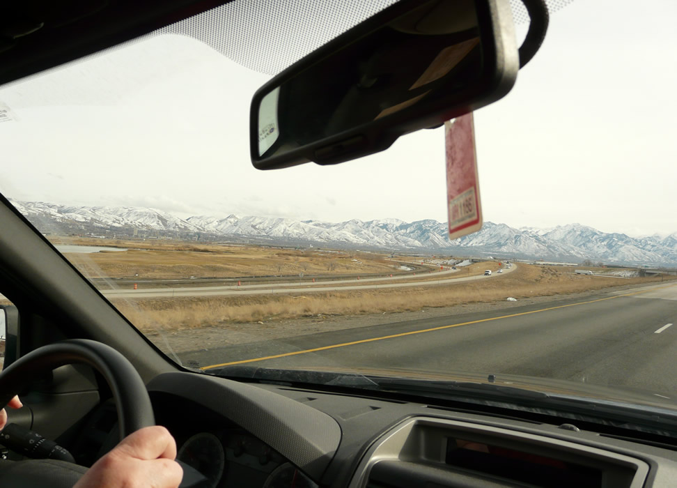 We have gone through the airport and have come back around going southeast. The TRAX airport right-of-way is the gray arc to the left of the roads. Wasatch Range is in distance. Return