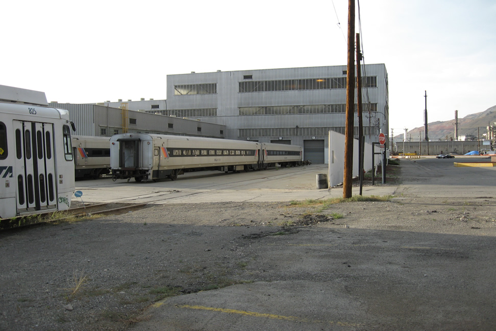 NJT cars at shop doors, light rail vehicles awaiting repair at left.