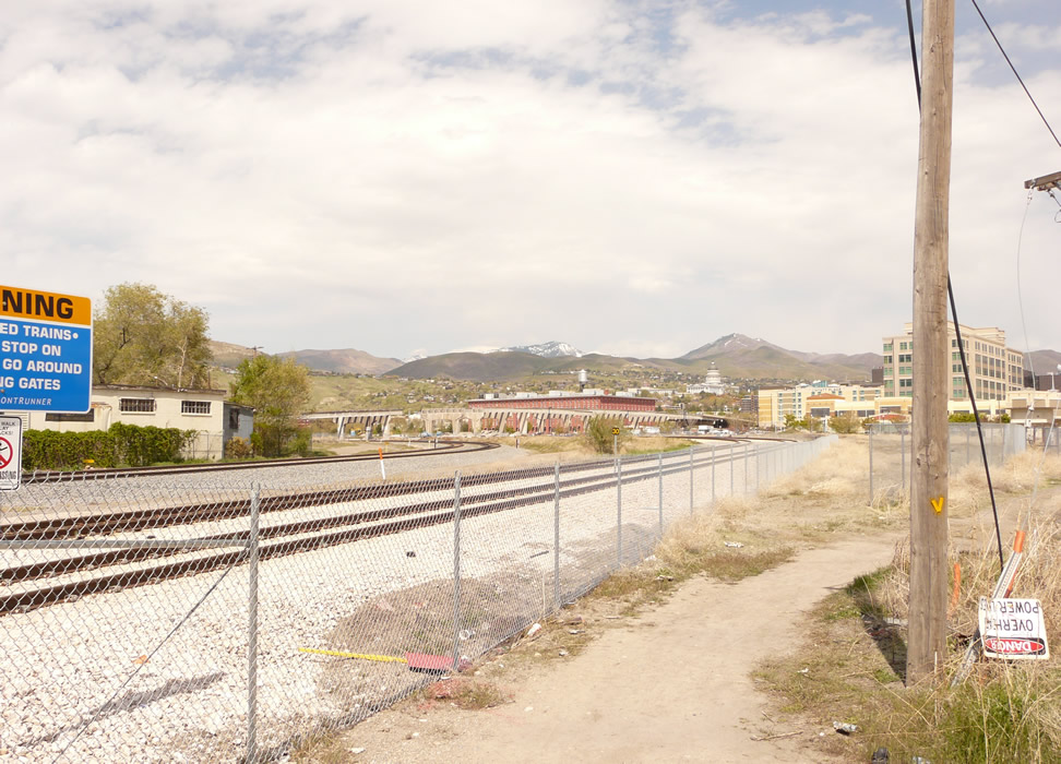 UP double track at left. Frontrunner North double track at right. Old Grants Tower at extreme right center. Return