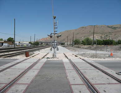 4th North Street Salt Lakc City, looking north, Grants Tower and the intermodal hub (Frontrunner's current southern goal) are behind us. Obviously this UP crossing signal has to go. Though Frontrunner is mostly single track, it will be double through here. |