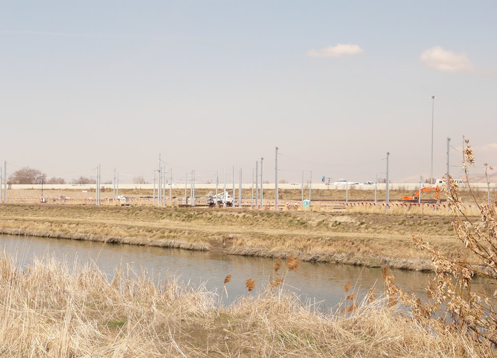 Farther east we see new catenary at the new shop complex, remodeled from an old warehouse.