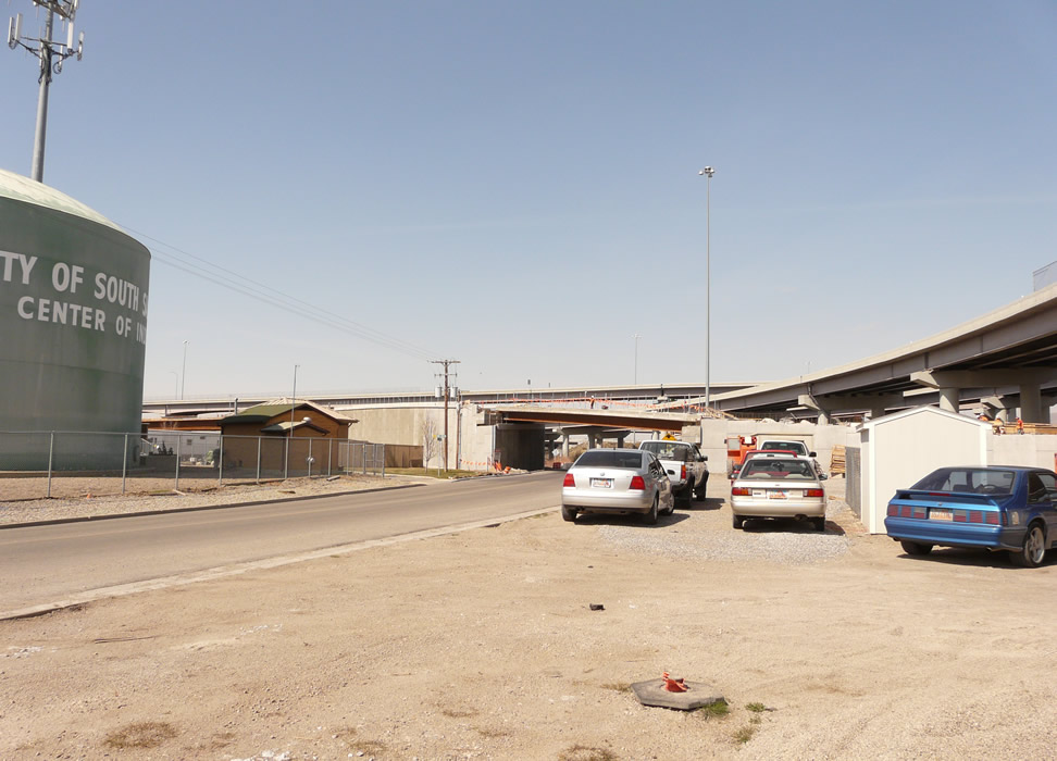 Farther east we are looking at the east approach to the bridge over Roper Yard. Structure nearest camera is TRAX. South Salt Lake City watertank is at left. Next